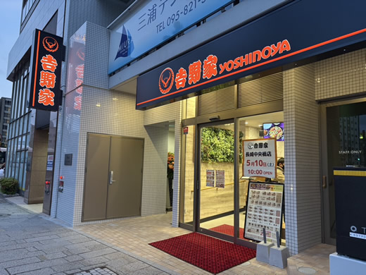 長崎市の中心部、浜町入口の中央橋交差点近くの新スタイルの吉野家です。